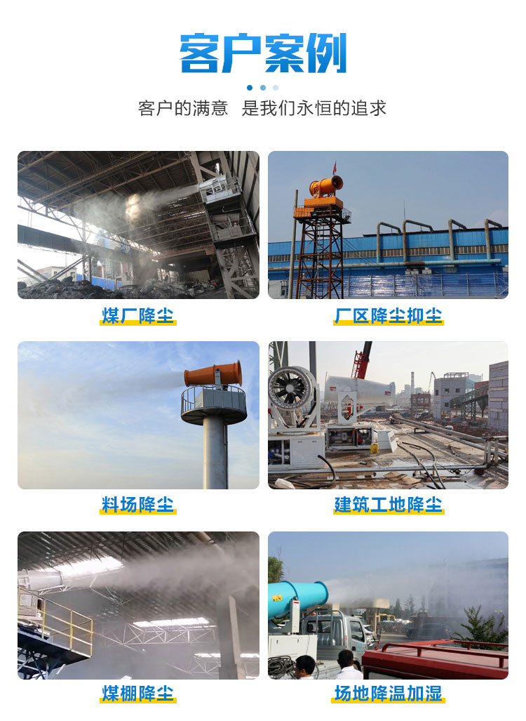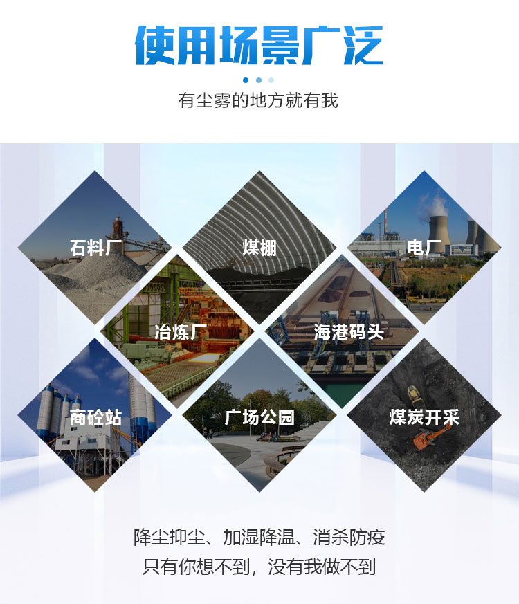 主要用途:建筑工地 煤場,礦場、料場、碼頭工業除塵,農業,園林綠化等飛機場、高速公路、車站、碼頭、公共場所、運動場地、炎熱場地等降塵保濕降溫消毒。