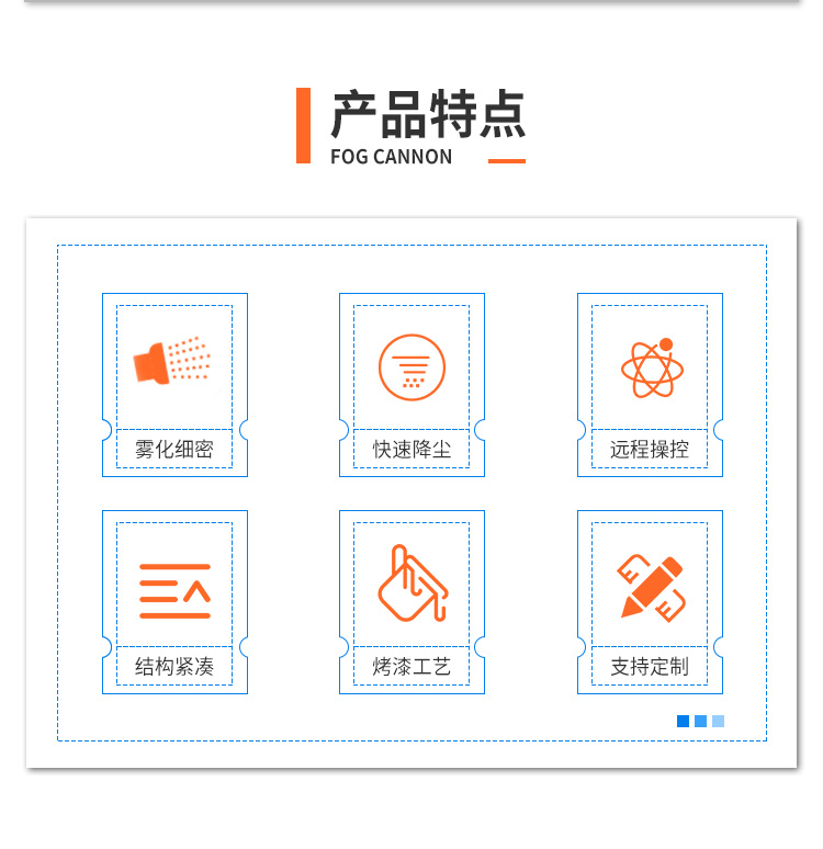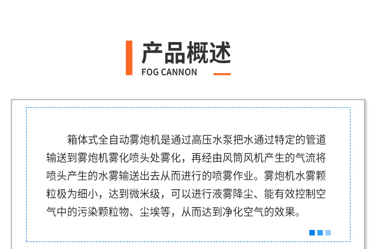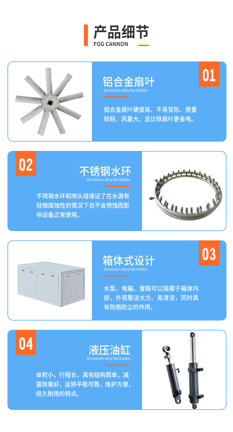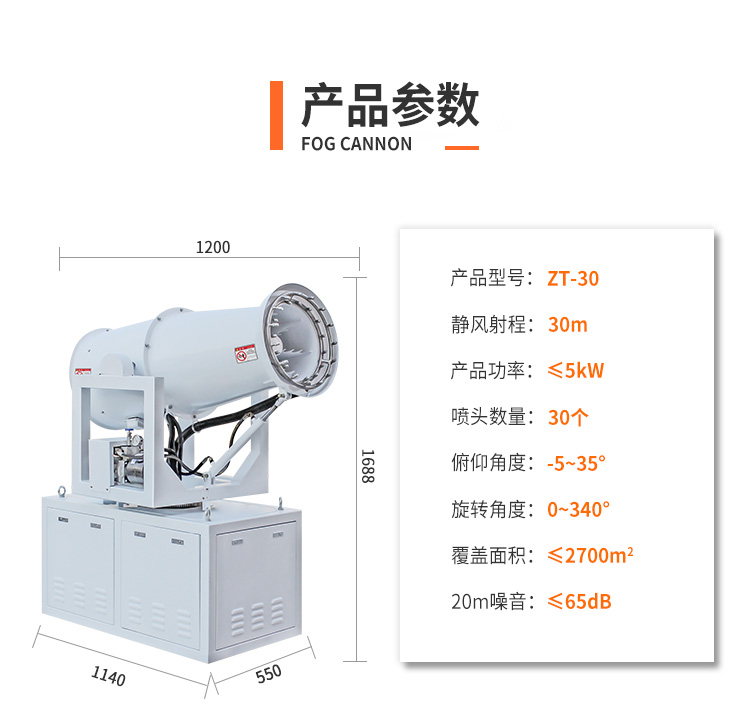 產品特點:30米全自動霧炮機水霧顆粒極為細小,達到微米級,可以進行液霧降塵、能有效控制空氣中的污染顆粒物、塵埃等,從而達到凈化空氣的效果。