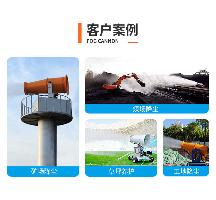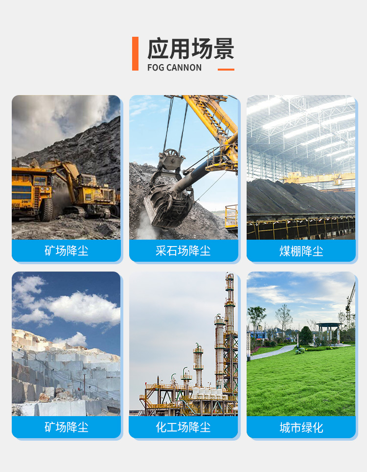 主要用途:適用于城市拆遷工地、冶金鋼鐵企業、采礦區域、煤化工企業、水泥廠、火力發電廠、建筑工地、物料和礦產品露天堆放廠、混凝土處理廠、垃圾堆放場、垃圾焚燒廠、沙廠、干式物料倉庫、露天爆破、重度粉塵區域。