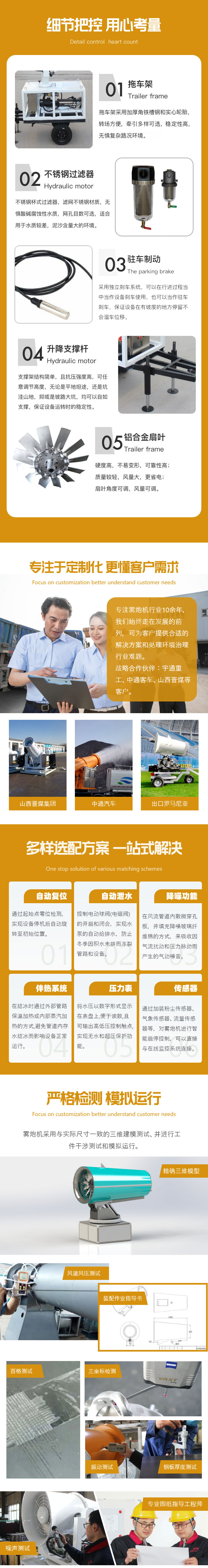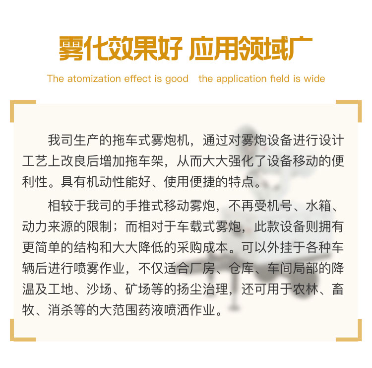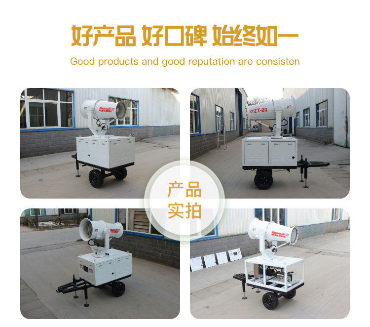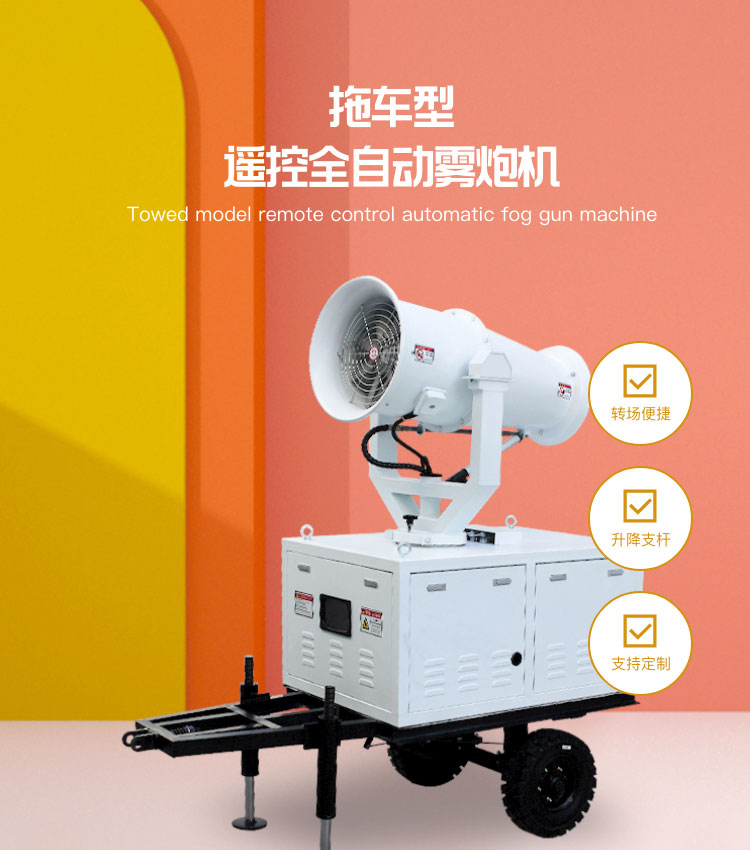 產品特點:拖車式遙控全自動霧炮機射程遠、機動性能好、使用便捷,支持遙控和人工控制操作。