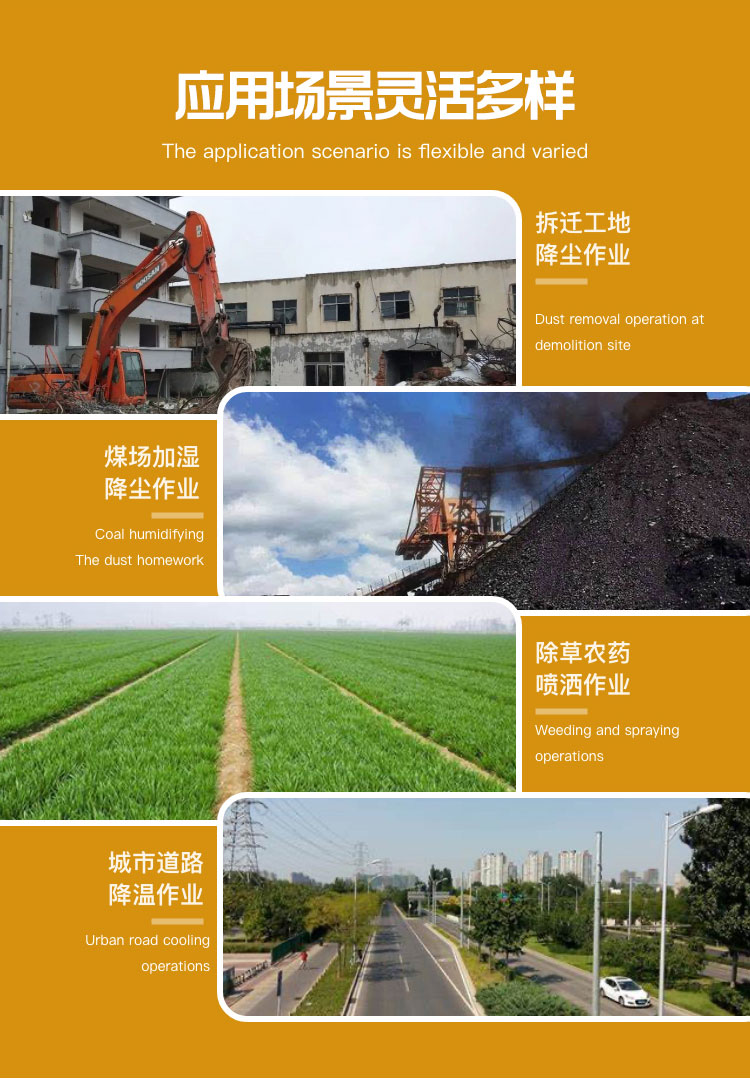 主要用途:建筑工地、冶金鋼鐵企業、采礦區域、煤化工企業、水泥廠、火力發電廠、建筑工地、物料和礦產品露天堆放廠、混凝土處理廠、垃圾堆放場、垃圾焚燒廠、沙廠、干式物料倉庫、露天爆破、重度粉塵區域。