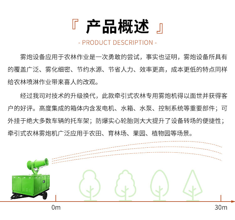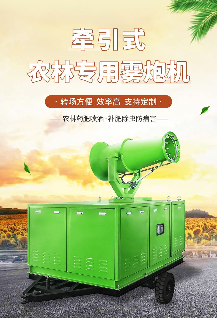 產品特點:牽引式農林霧炮機耐腐蝕、防生銹,可移動式設計,打藥方便,噴灑便捷。