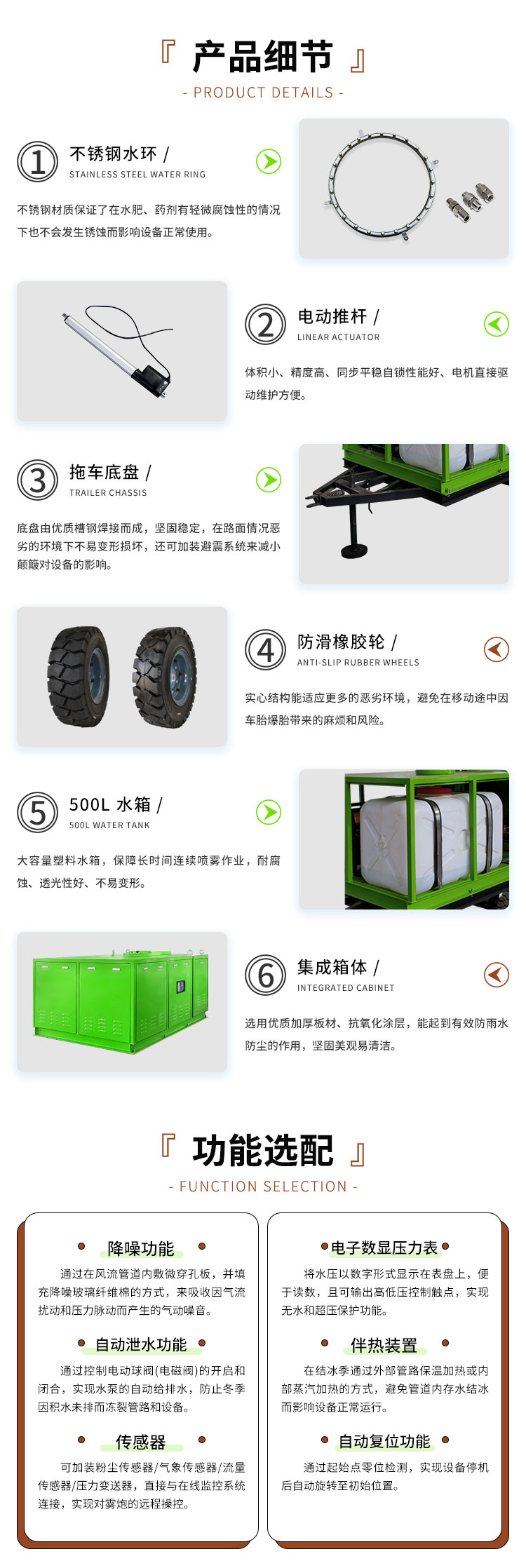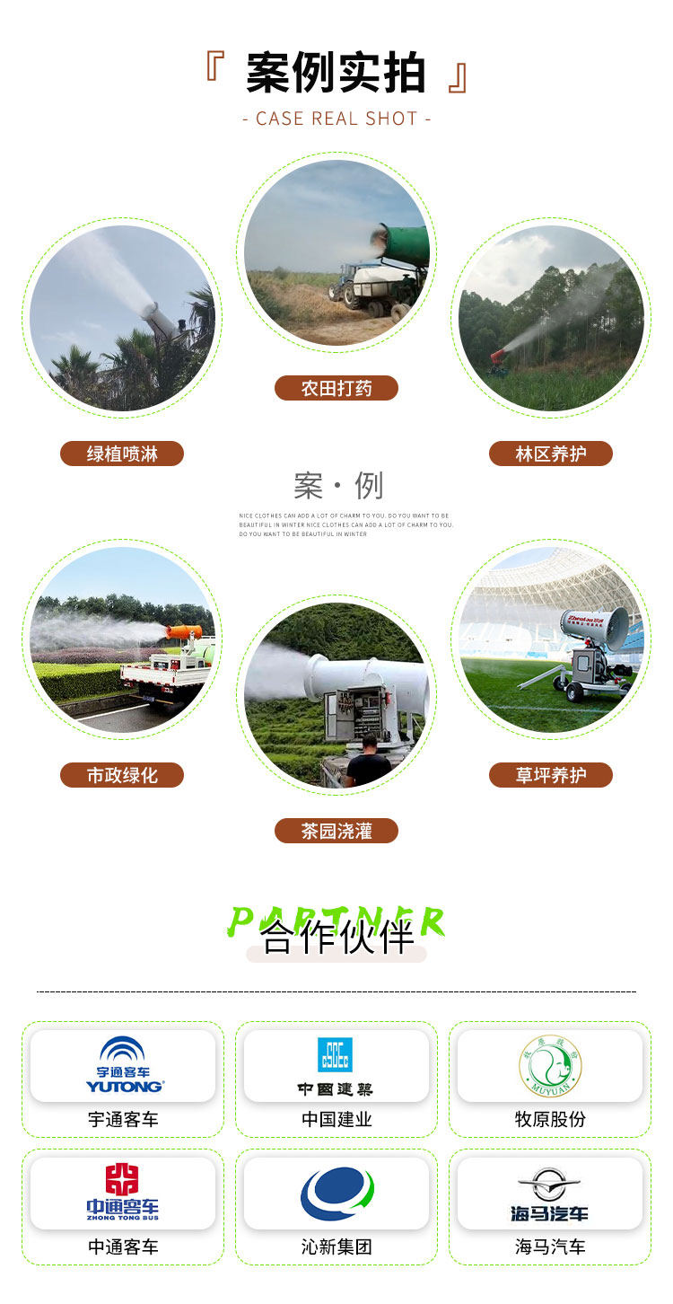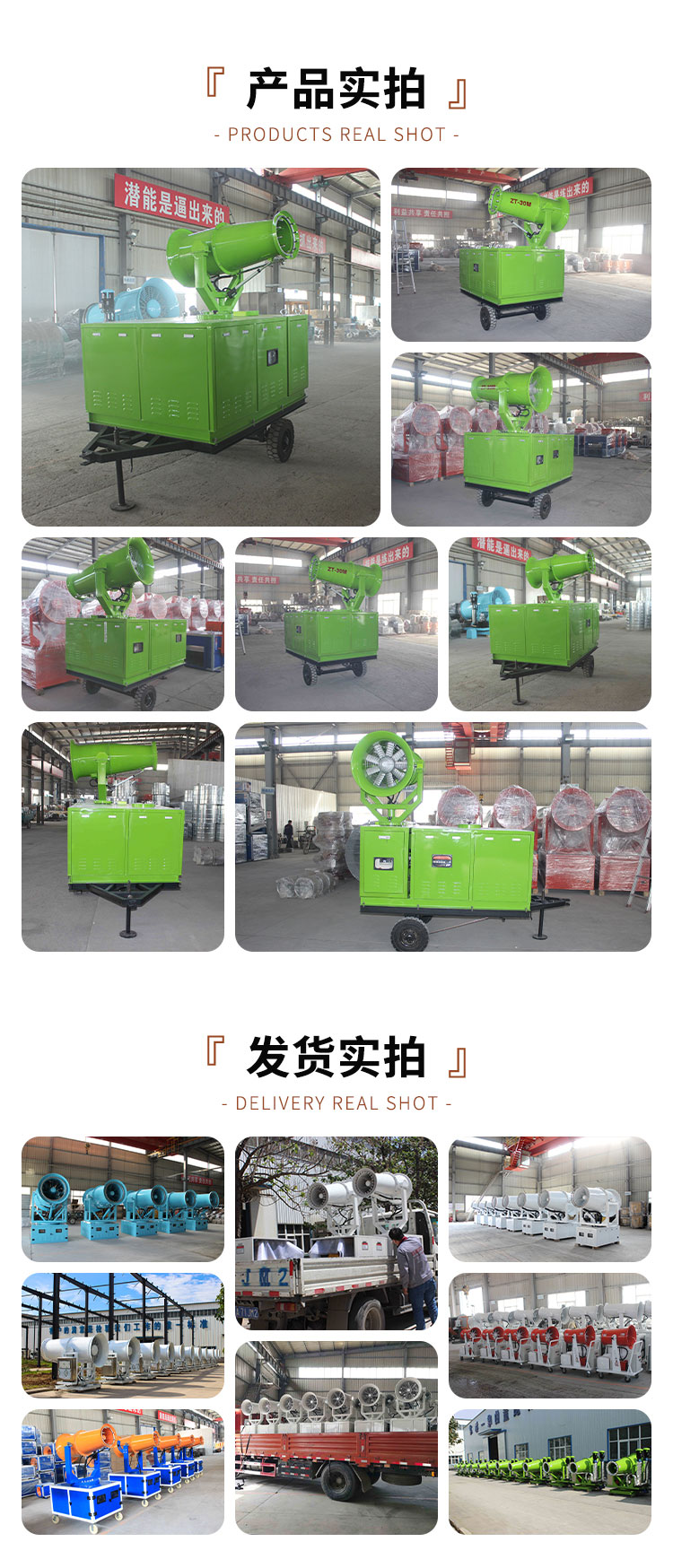 主要用途:建筑工地、煤場、電廠、焦化廠、鋼廠、工業除塵抑塵等;農業,園林綠化、飛機場、高速公路、車站、碼頭、公共場所、運動場地、炎熱場地等防疫消毒保濕降溫。