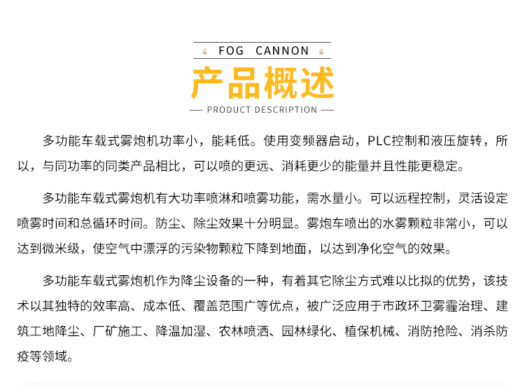產品特點:多功能霧炮機射程遠、覆蓋范圍廣、工作效率高、可以實現精量噴霧;配套動力靈活,使用安全可靠。