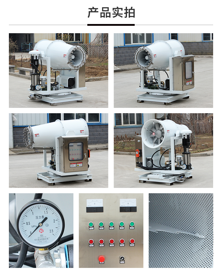 產品特點:這款30米低噪音霧炮機,靜風射程25-35米,是鄭通霧炮機廠家生產,具有噪音低,噴霧范圍廣,霧化細等特點,由不銹鋼多級離心泵,不銹鋼電控箱,液壓油缸支撐以及不銹鋼水環及噴頭組成,采用最新消音降噪結構。在建筑工地降塵,水泥廠揚塵,農田打藥,消毒噴灑,城市道路降塵降溫,煤場礦區除塵等場景備受歡迎!