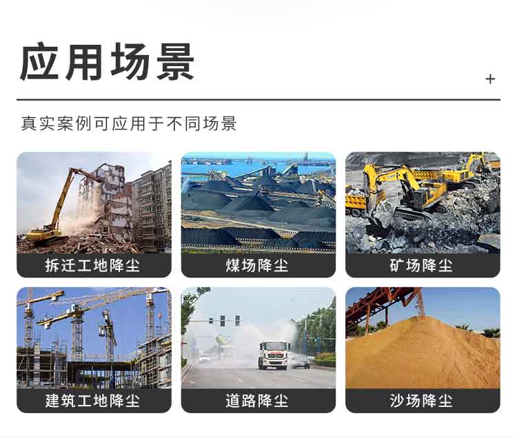 主要用途:冶金鋼鐵企業、采礦區域、煤化工企業、水泥廠、火力發電廠、城市拆遷工地、建筑工地、露天堆放廠、混凝土處理廠、垃圾堆放場、垃圾焚燒廠、城市道路降塵、噴霧打藥等場景。