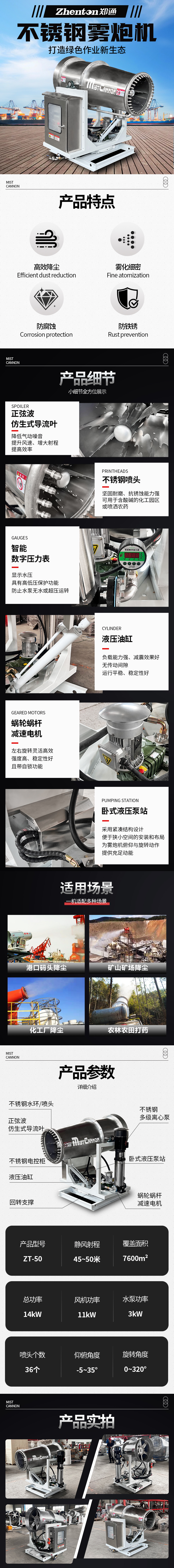 產品特點:不銹鋼霧炮機是鄭州鄭通風機制造有限公司新款升級,50米左右的射程,總功率14KW,噴霧范圍可達7200㎡,36個不銹鋼噴頭,堅固耐用,抗銹蝕能力強。炮筒采用不銹鋼材質,霧化細密,防腐蝕防鐵銹。風筒設計采用正弦波仿生式導流葉,不僅降氣動噪聲還提高風速、增大射程,大大提高了除塵效率。有手動,全自動,遠程遙控,智能系統等控制方式。15-150米射程,型號齊全,支持定制,有需要請聯系:17303712073(微信同號)